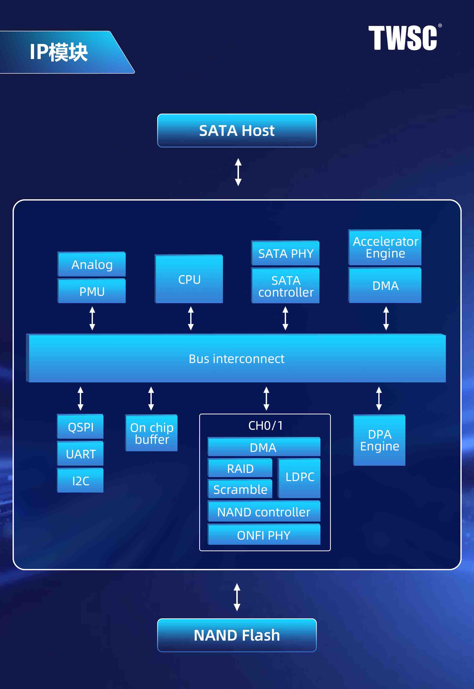 通过TW6501 SATA SSD存储控制芯片核心IP模块及SSD产品的自主研发,公司掌握了新一代存储介质管理、硬件加速引擎及软硬件协同、数据安全以及低功耗设计方案等核心关键技术,在“数据读写、处理到存储”全流程数据路径关键环节,建立起流畅交互、高效运算、安全管理及能耗管控综合能效优化体系,全方位驱动存储芯片的高效运算和品质提升。