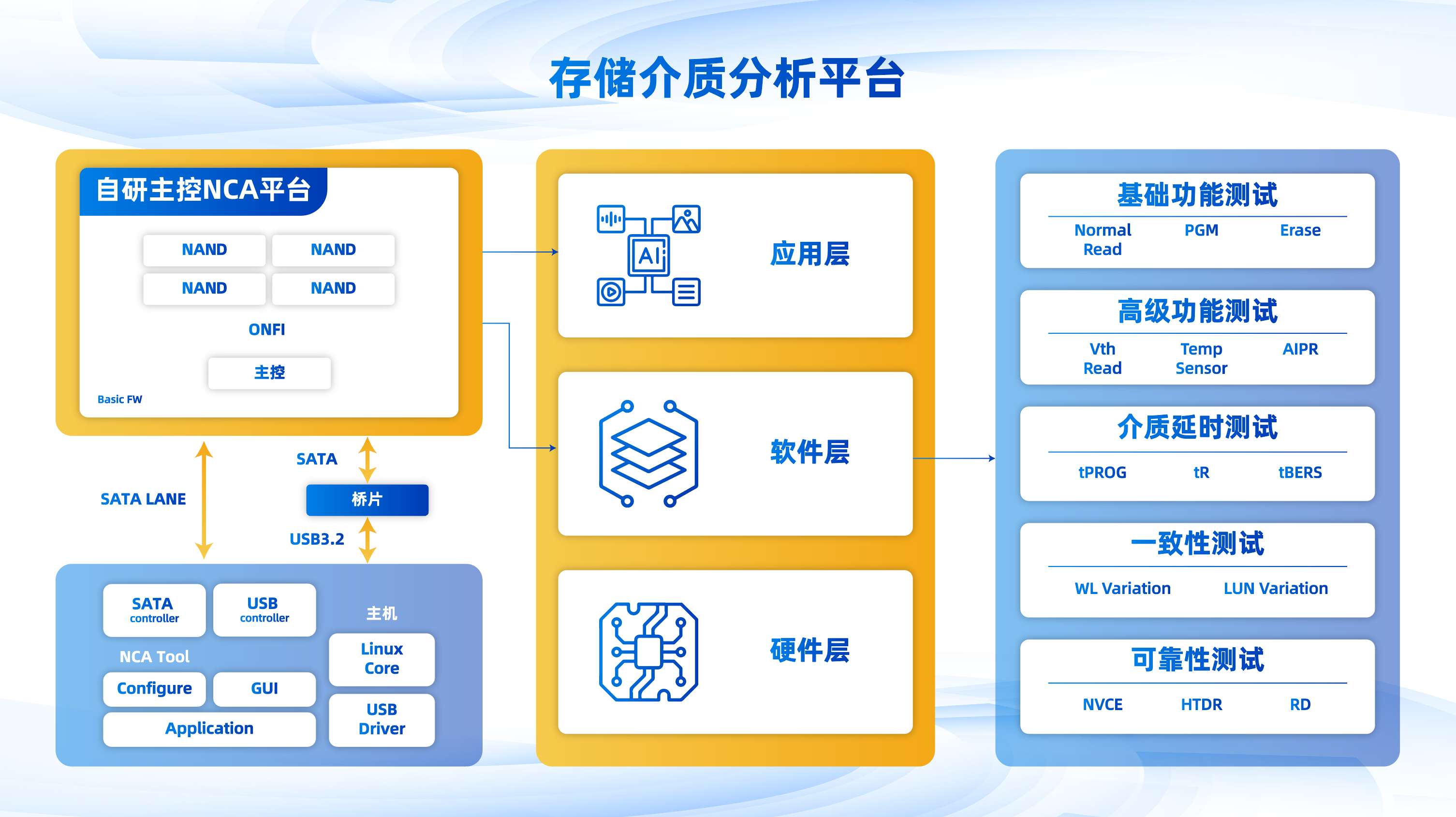 以自研主控方案搭建的介质分析技术平台,支持不同类型NAND Flash介质的多层面和多维度特性评估,依托自动化测试ATE、SLT平台及批量验证改进方案,优化坏块管理和磨损均衡策略,确保数据的完整性、有效性。