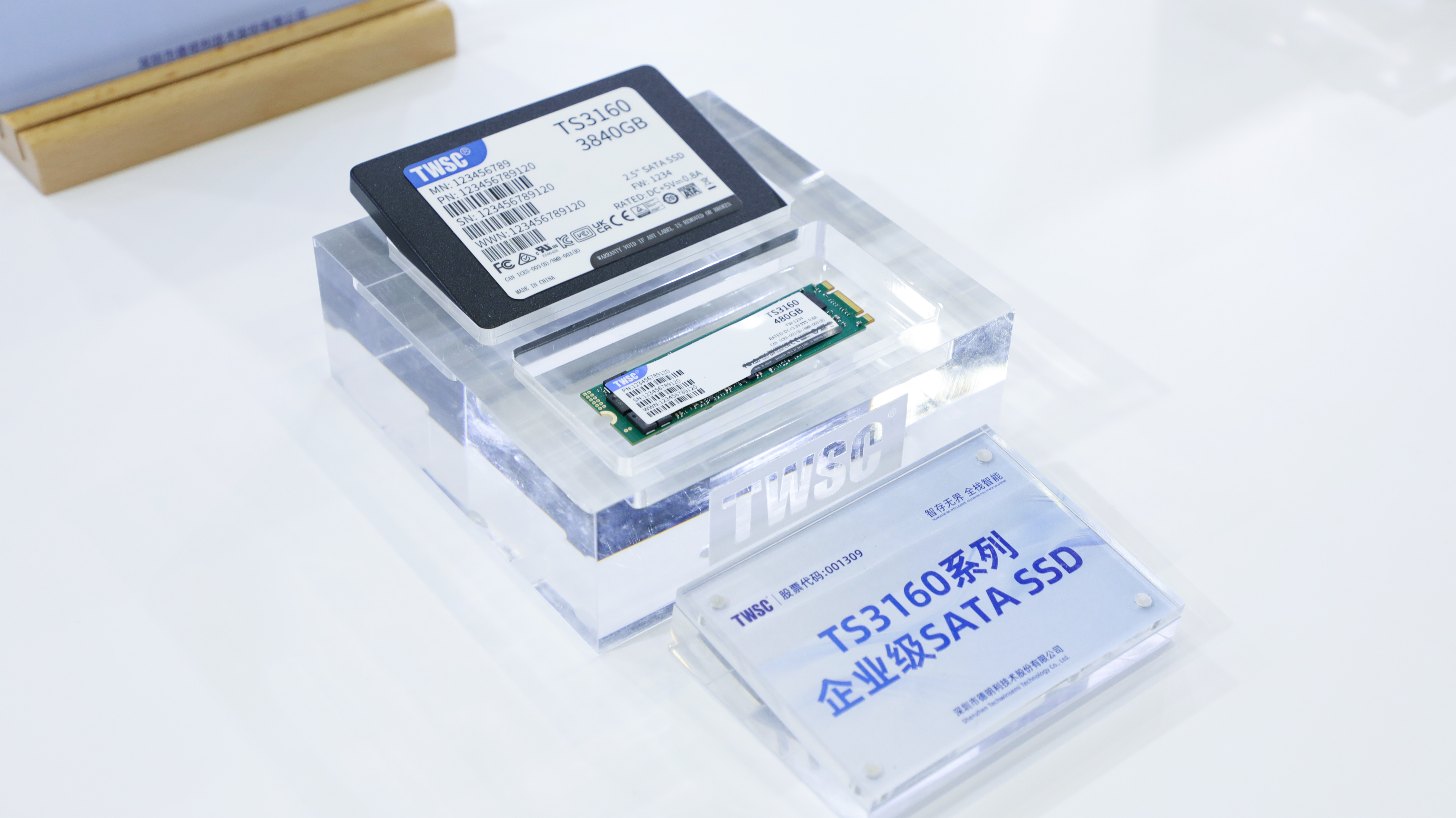 在苏州耶普展位现场,展示了TWSC品牌SATA SSD产品,该SATA启动盘专为云服务器基础架构优化设计,具备安全可靠、性能稳定的特点。